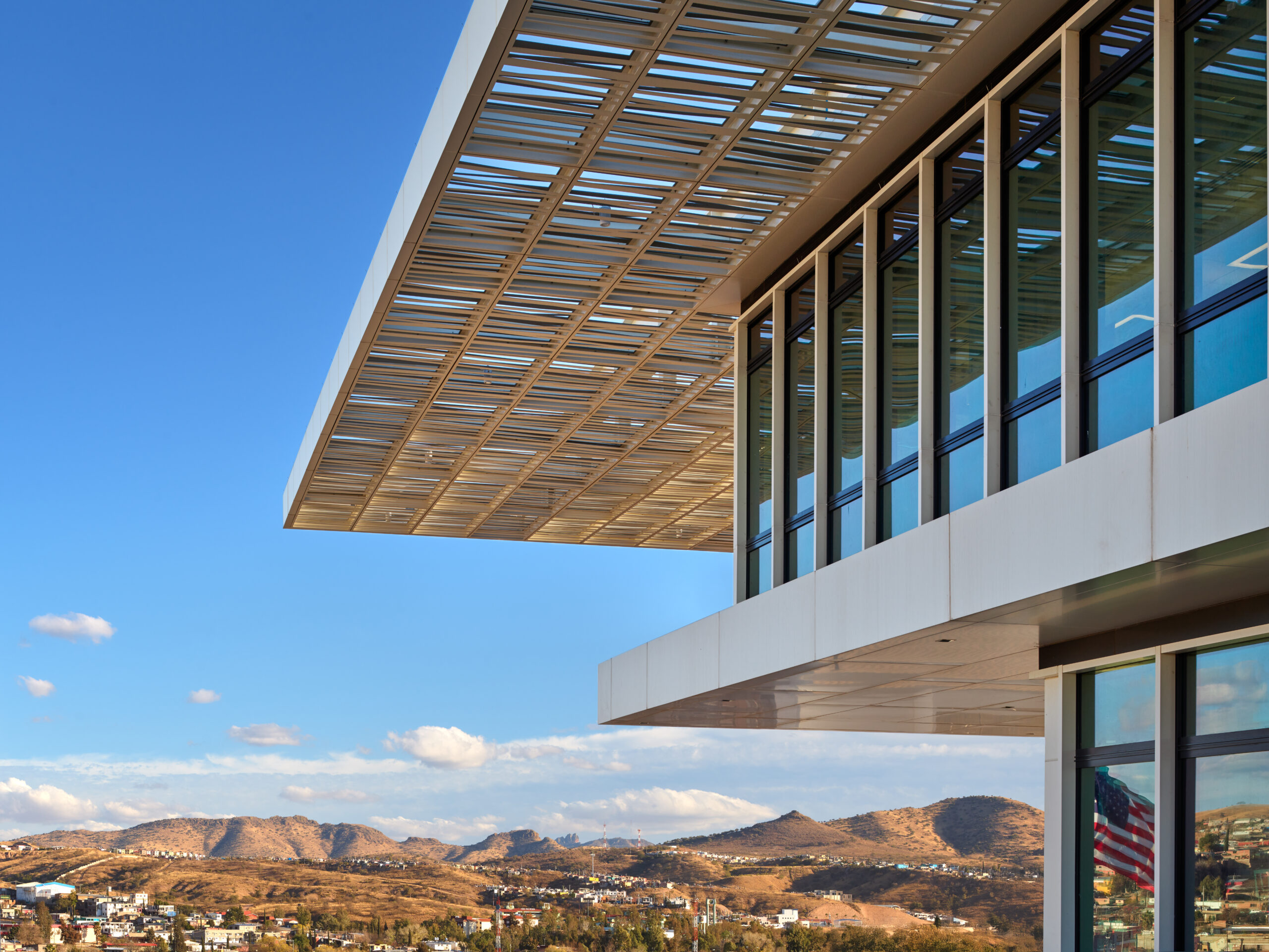 The Nogales landscape is defined by the surrounding hills of desert pine-oak grassland. Influenced by this landscape and the shared culture of the border area, the architecture draws inspiration from the local material palette, including stone and wood, and traditional building techniques like the Ramada. The modern Ramada canopies shade and protect the building’s outdoor spaces, replacing the traditional thatched roof structure with lightweight laser-cut aluminum panels.