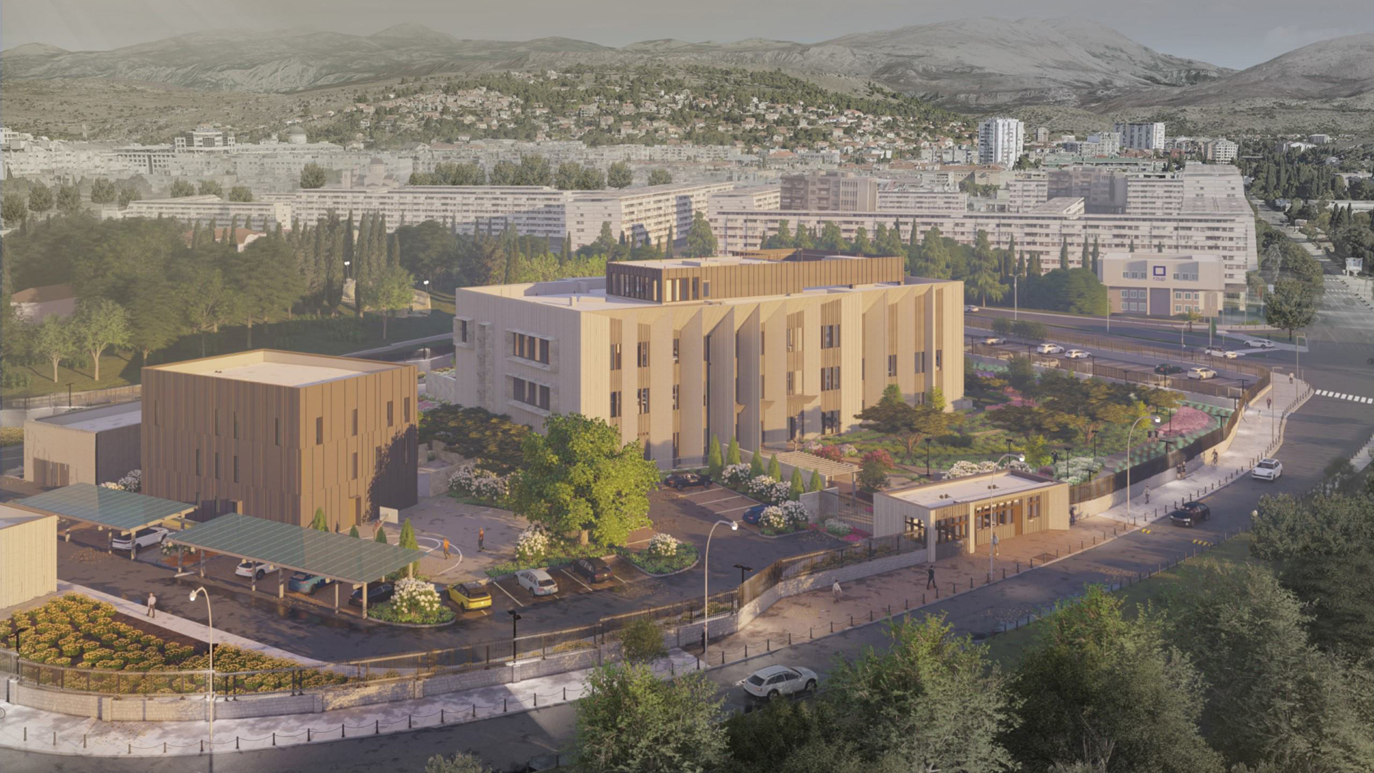 The new project design aims to create a civic presence at the base of the neighboring Park Petrovića near the Moraca River. Through the use of locally sourced stone in the building facades and in the site hardscapes, the design reflects local architectural vernacular, but in a monumental manner that uplifts the surrounding public spaces. The buildings and landscape elements evoke the area’s historic landscapes and visually tie the site to the park.